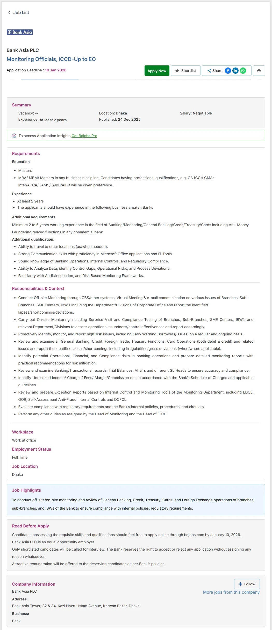ব্যাংক এশিয়া লিমিটেড চাকরির বিজ্ঞপ্তি ২০২৬ (Bank Asia Limited Job Circular 2026) বাংলাদেশের প্রাইভেট খাতে ক্যারিয়ার গঠনের সুযোগ খুঁজছেন প্রার্থীদের জন্য প্রকাশিত হয়েছে। ব্যাংক এশিয়া লিমিটেড অনিদিষ্ট সংখ্যক যোগ্য নারী ও পুরুষ প্রার্থীর মধ্যে থেকে মনিটরিং কর্মকর্তা (আইসিসিডি-আপ টু ইও) পদে নিয়োগ দেওয়ার জন্য এই সার্কুলার প্রকাশ করেছে।