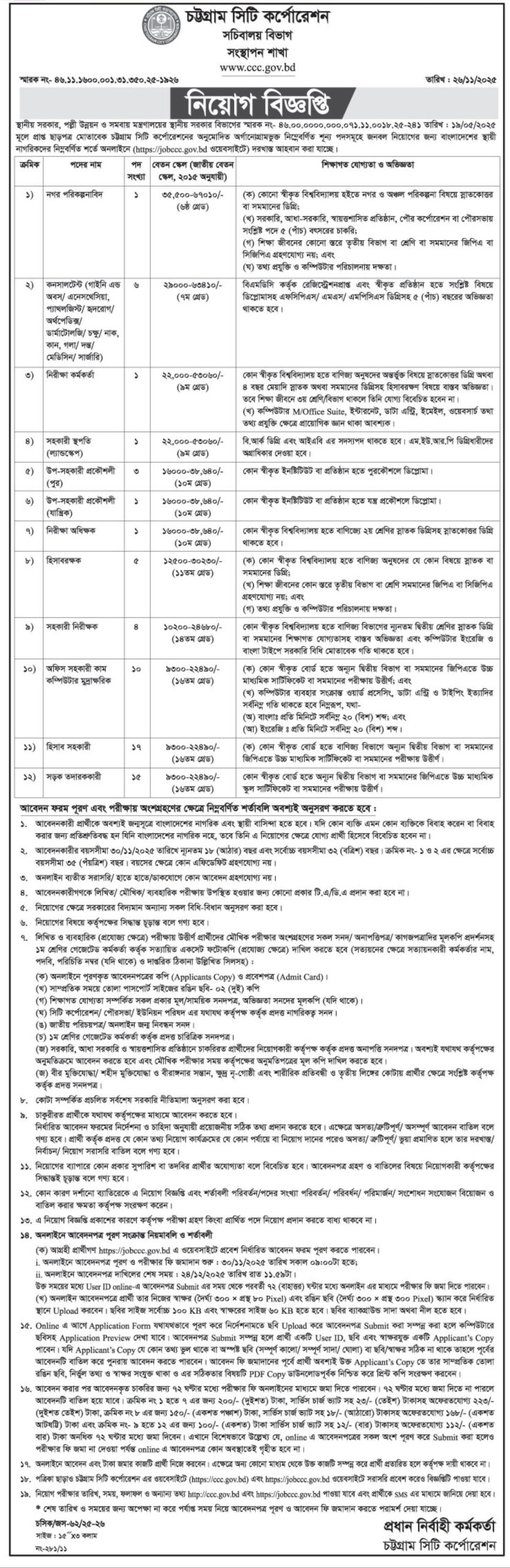 চট্টগ্রাম সিটি কর্পোরেশন নিয়োগ বিজ্ঞপ্তি Chattogram City Corporation Job Circular 2026 চট্টগ্রাম সিটি কর্পোরেশন এবার ঘোষণা করেছে নতুন নিয়োগের সুযোগ! মোট ১২টি পদে ৬৫ জনকে নিয়োগ দেয়া হবে। এই সুযোগে নারী-পুরুষ উভয়ই আবেদন করতে পারবেন। আগ্রহী প্রার্থীরা সহজেই অনলাইনের মাধ্যমে আবেদন করতে পারবেন। যদি আপনি যোগ্য ও উৎসাহী হন, তাহলে এই চাকরির জন্য অবশ্যই আবেদন করতে পারেন। বিস্তারিত নিয়োগ সংক্রান্ত বিজ্ঞপ্তি নিচে দেওয়া হলো।
