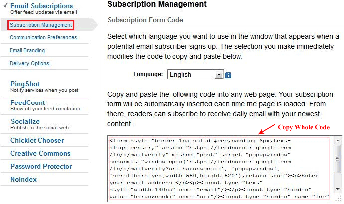 - এরপর নিচের চিত্রটি দেখুন যেখানে থেকে কোডগুলি নিয়ে আপনার ব্লগে ইমেইল Subscription ফরম ব্যবহার করতে পারবেন।